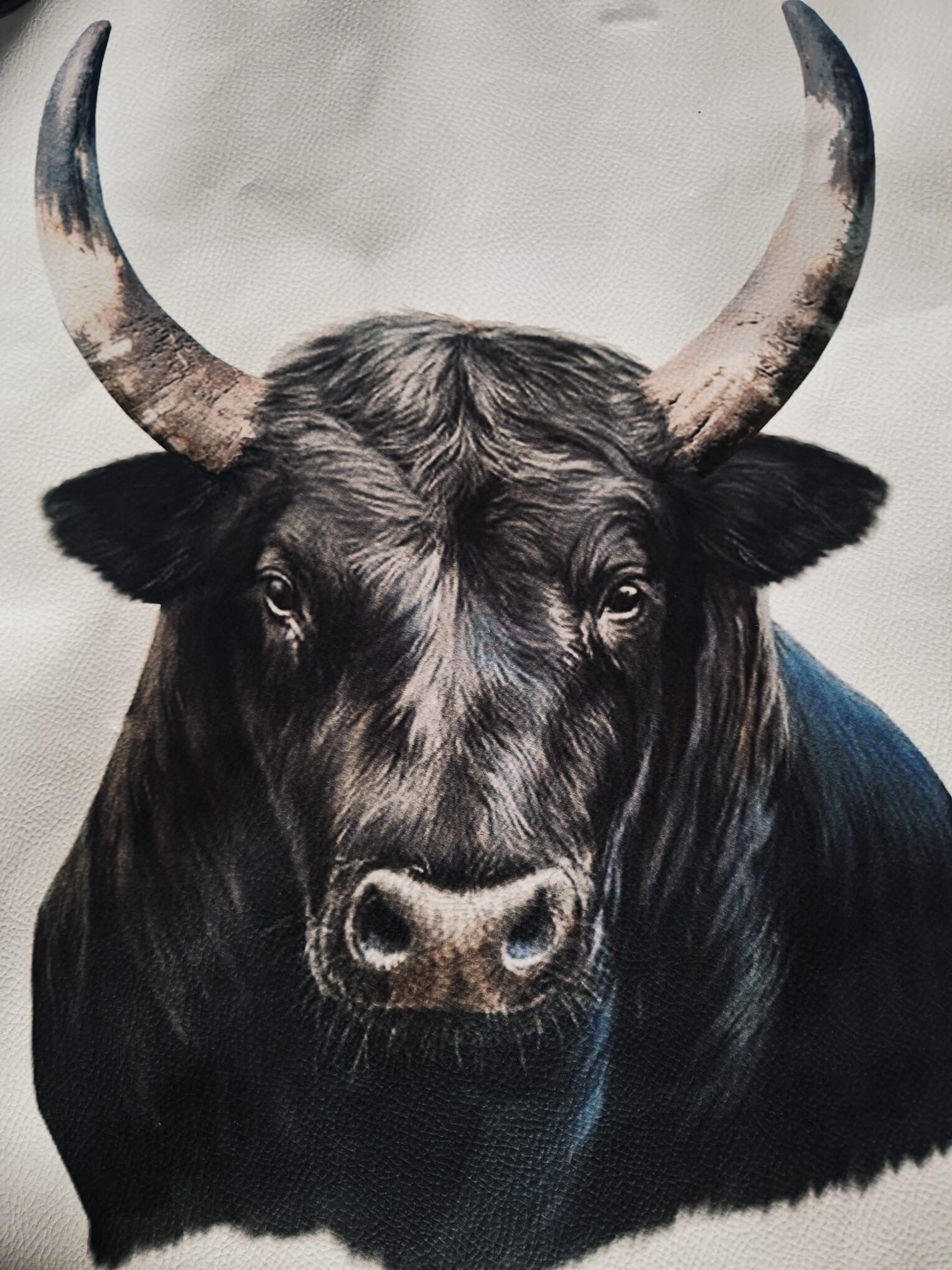 Soepele grijze stof, tekening "stier" van leer. Boordje, kaki.Donkerbruine voering. Steekzakken aanwezig!